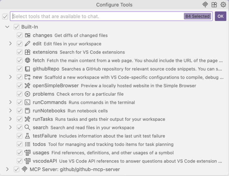 Developers can hit the little Settings/Gear icon within the GitHub Copilot AI chat window – and voila, you see all the default MCP Tools the Agent has access to.
