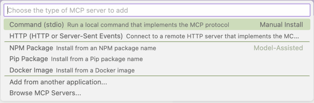 Developers can add new MCP Servers/Tools to their toolchain – published MCP tools can be added through Pip/UV/Docker/NPM.