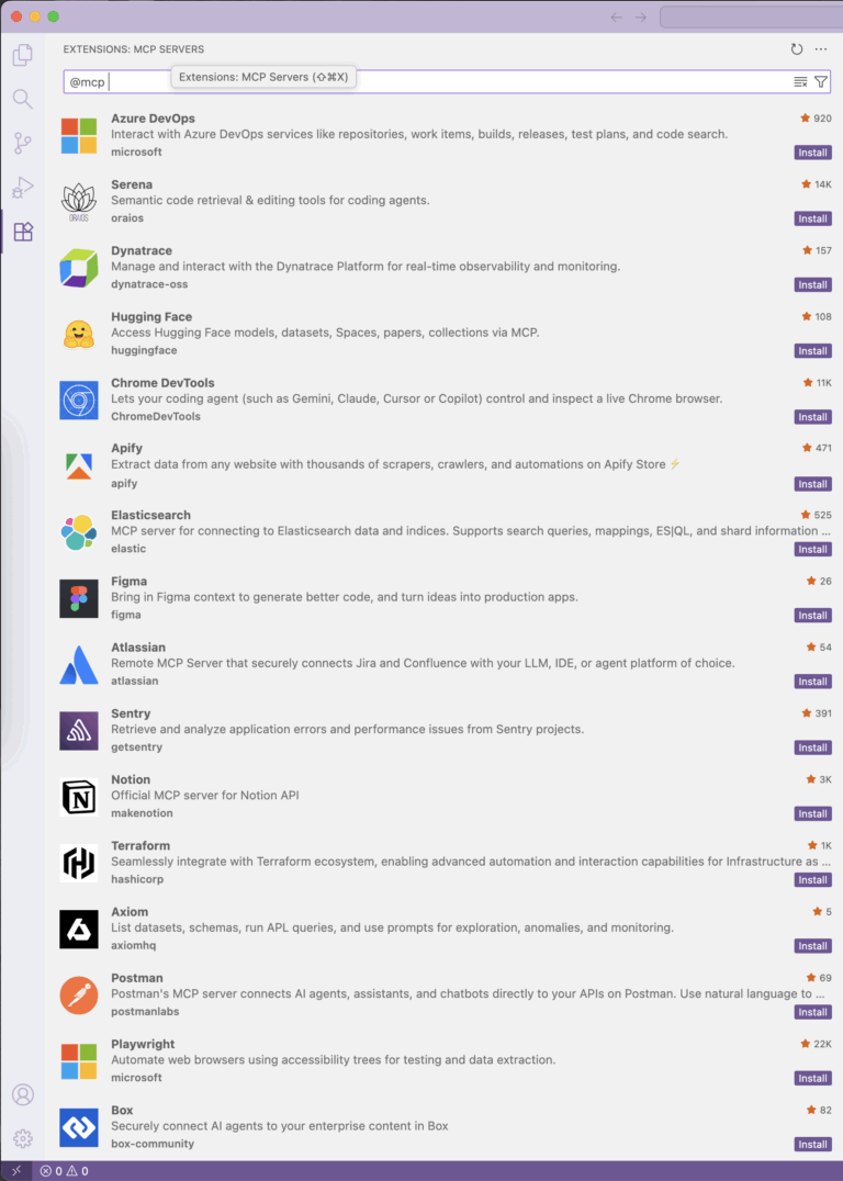 With Visual Studio/VS Code, there is starting to be a Marketplace for MCP Servers/Tools – developers can simply browse and one-click install preferred MCP Tools for AI Agents to have more contextual muscle.