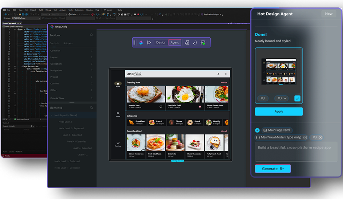 Changes made in either environment, using Hot Design agent, code, or the designer are instantly reflected in both the live app and the underlying XAML code, ensuring a single source of truth.